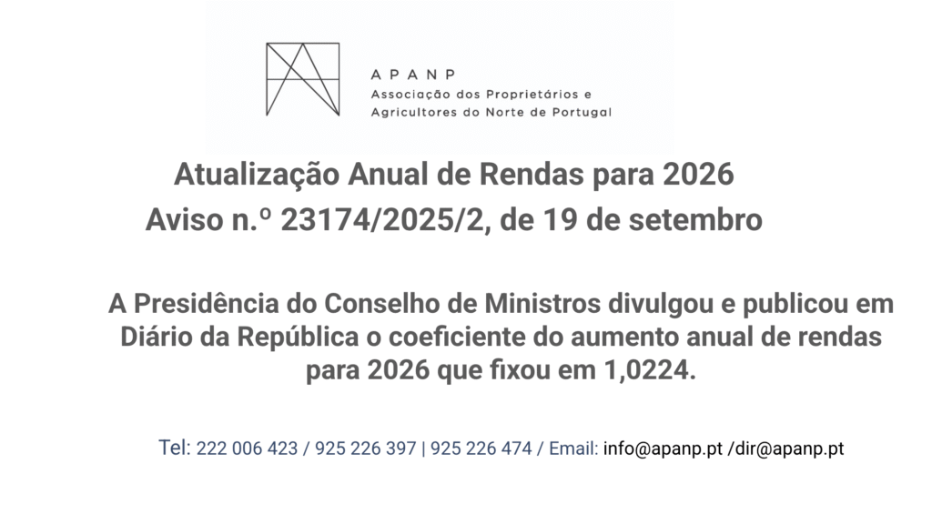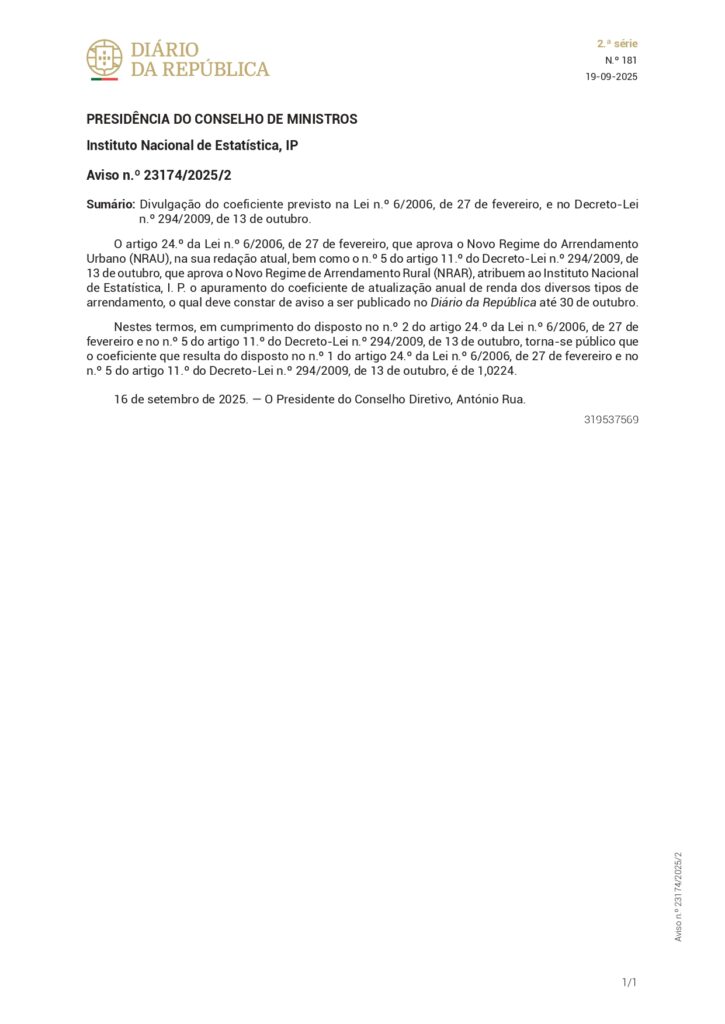 O artigo 24.º da Lei n.º 6/2006, de 27 de fevereiro, que aprova o Novo Regime do Arrendamento Urbano (NRAU), na sua redação atual, bem como o n.º 5 do artigo 11.º do Decreto-Lei n.º 294/2009, de 13 de outubro, que aprova o Novo Regime de Arrendamento Rural (NRAR), atribuem ao Instituto Nacional de Estatística, I. P. o apuramento do coeficiente de atualização anual de renda dos diversos tipos de arrendamento, o qual deve constar de aviso a ser publicado no Diário da República até 30 de outubro.